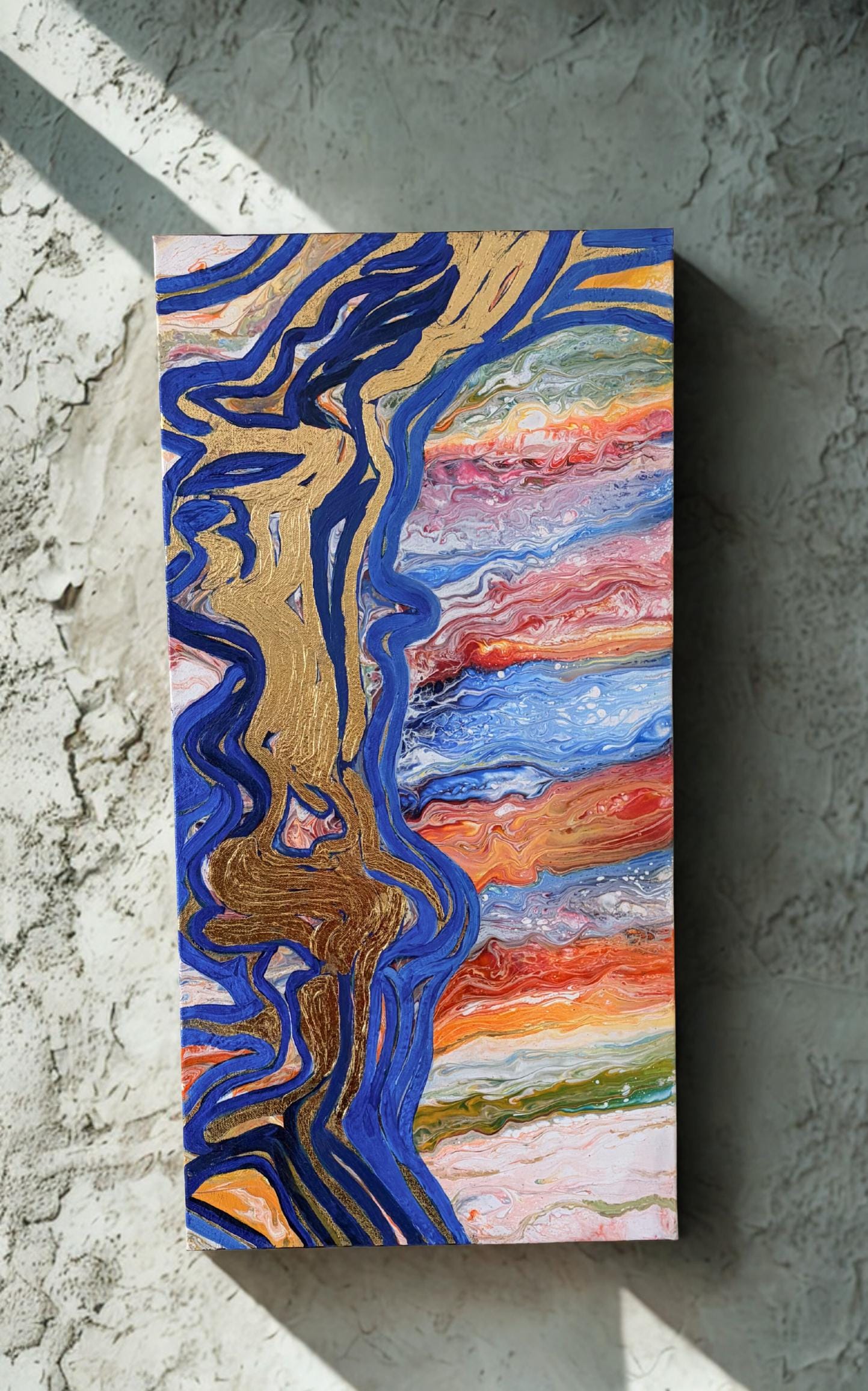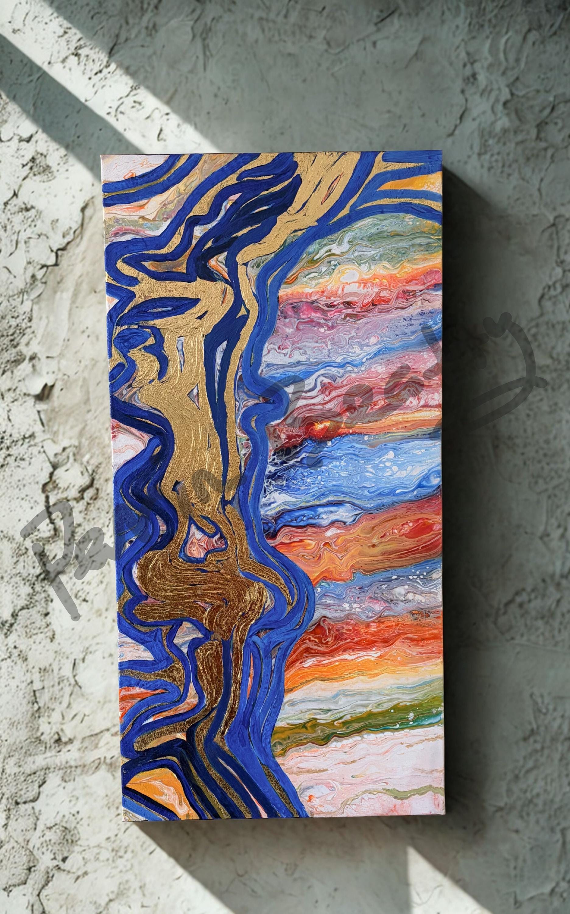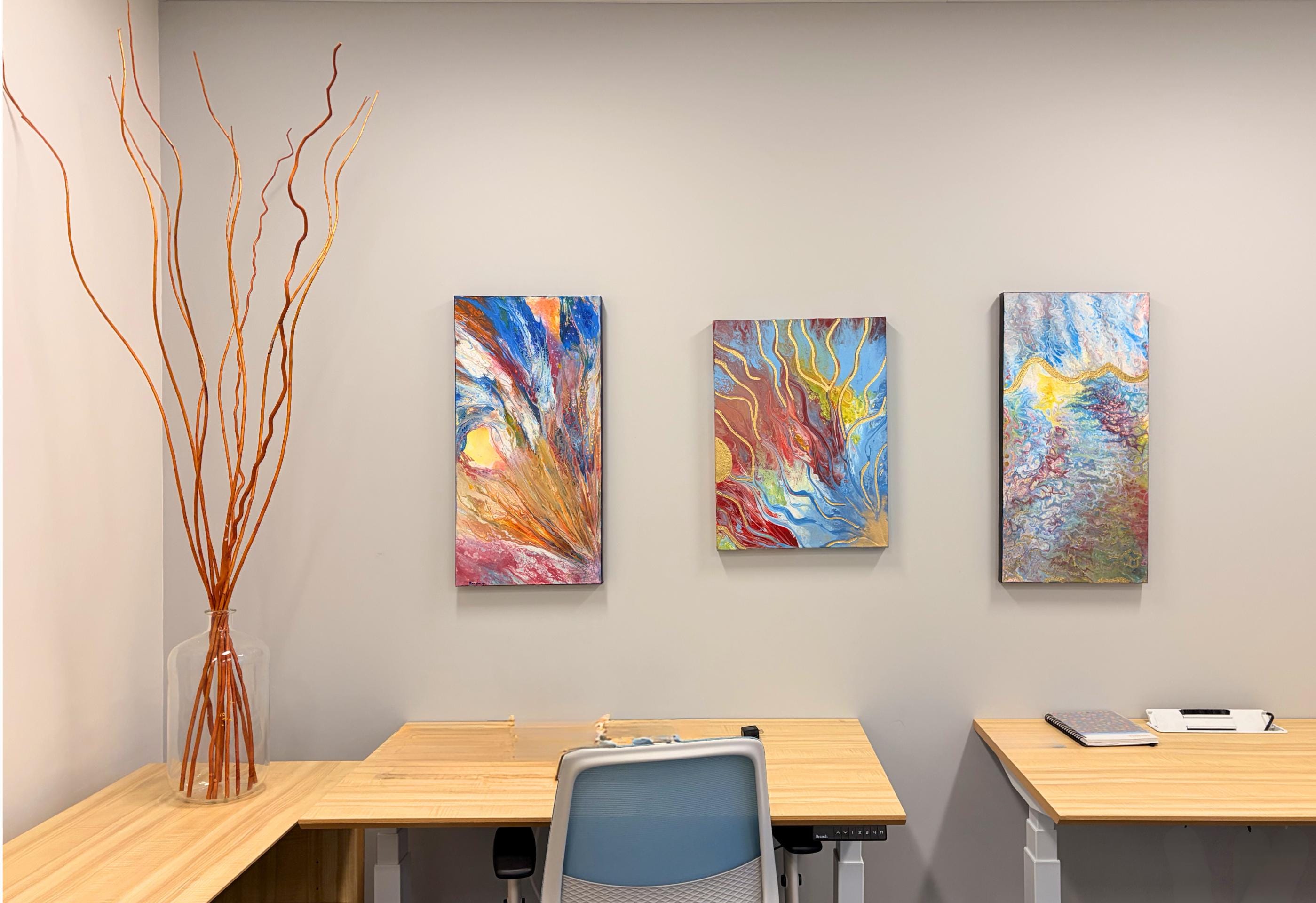 Left to right: Creative Chaos, 15 x 30 x 1.5 inches, Golden Cheer, 24 x 18 x 1.5 inches, Gold Pond, 15 x 30 x 1.5 inches, Acrylic on Canvas, COMMISSIONED and SOLD.