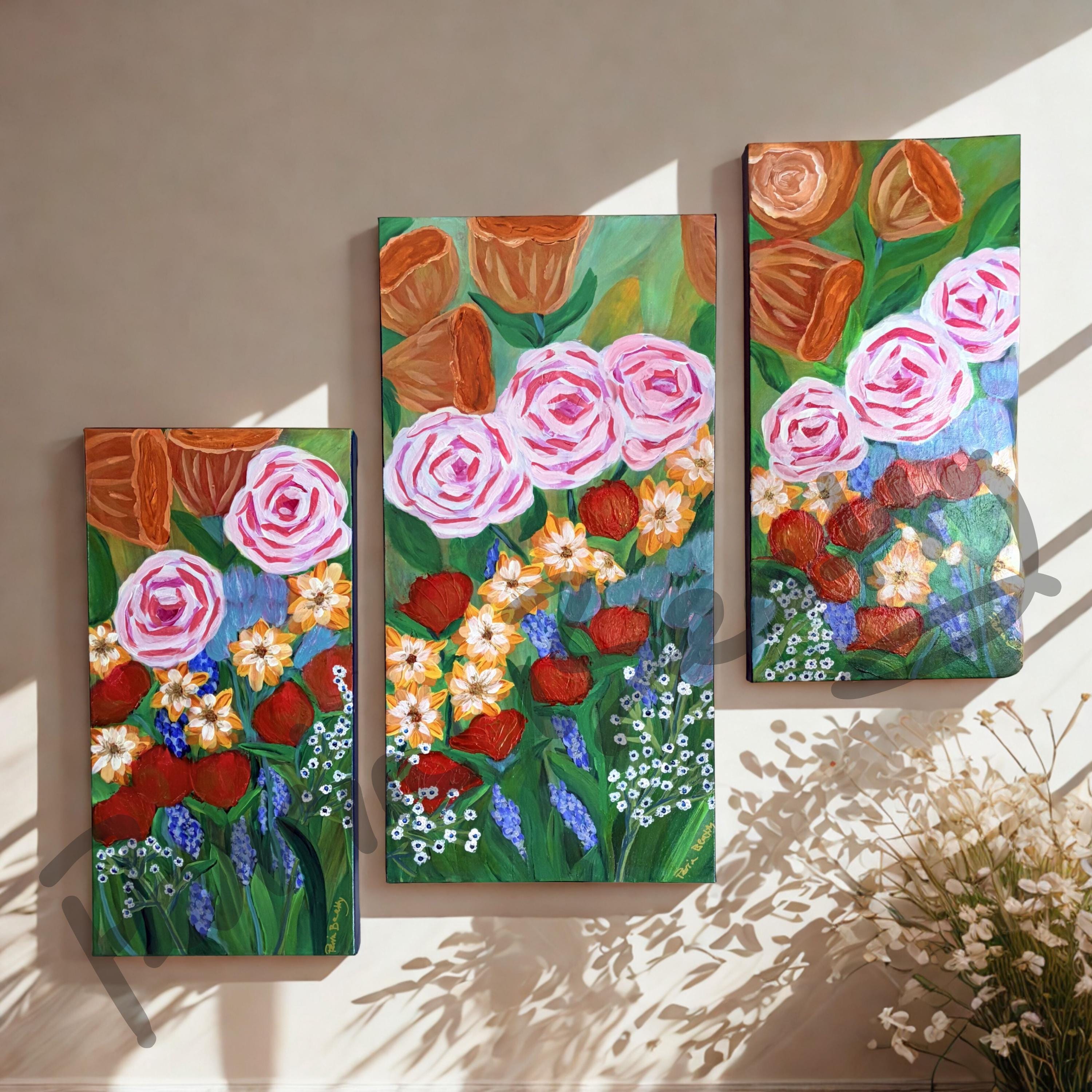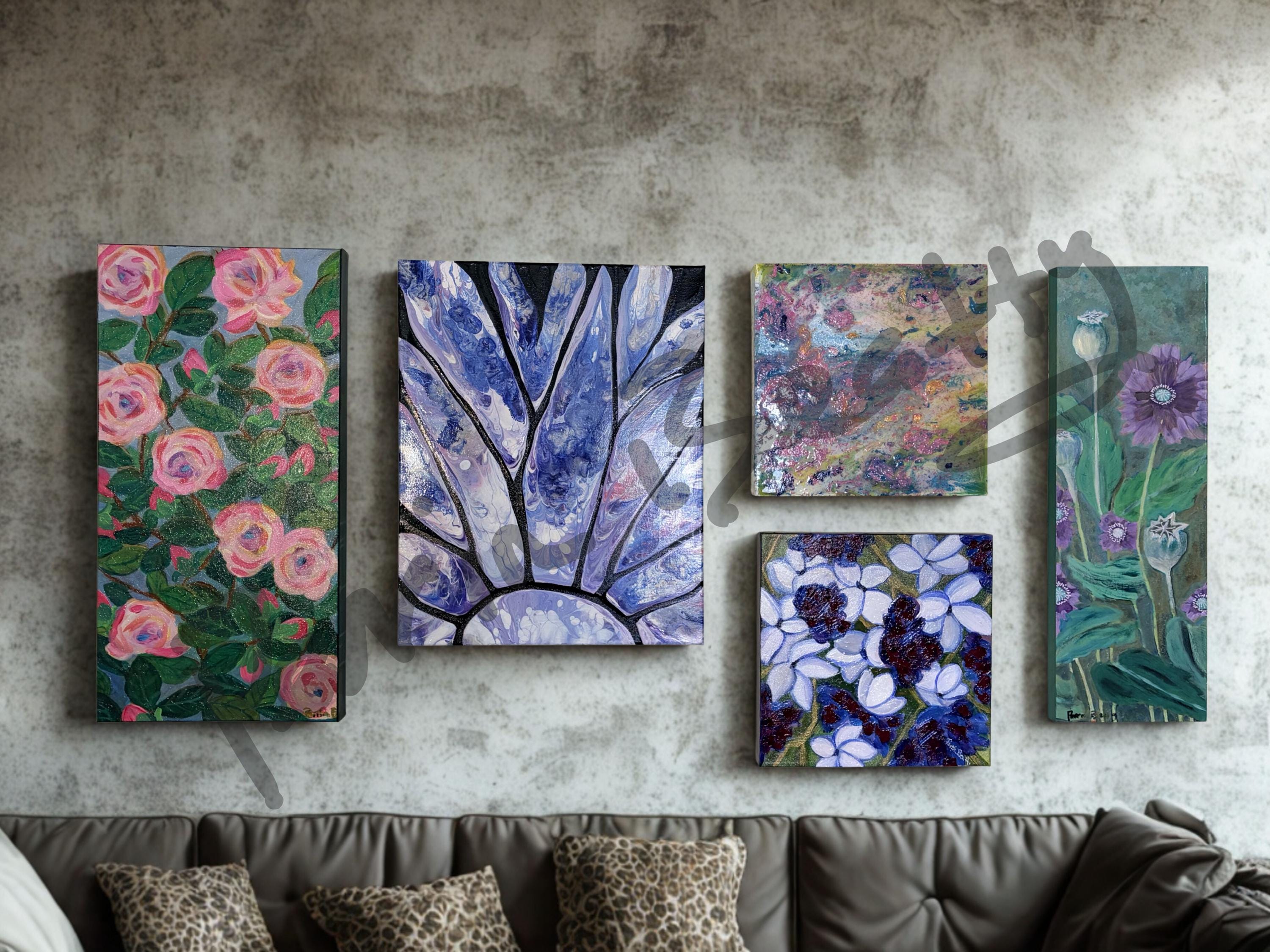 Wall of Art from left to right: Prairie Rose, Blue Daisy, Beach Party (top), Forbidden Flowers (bottom), Poppies.