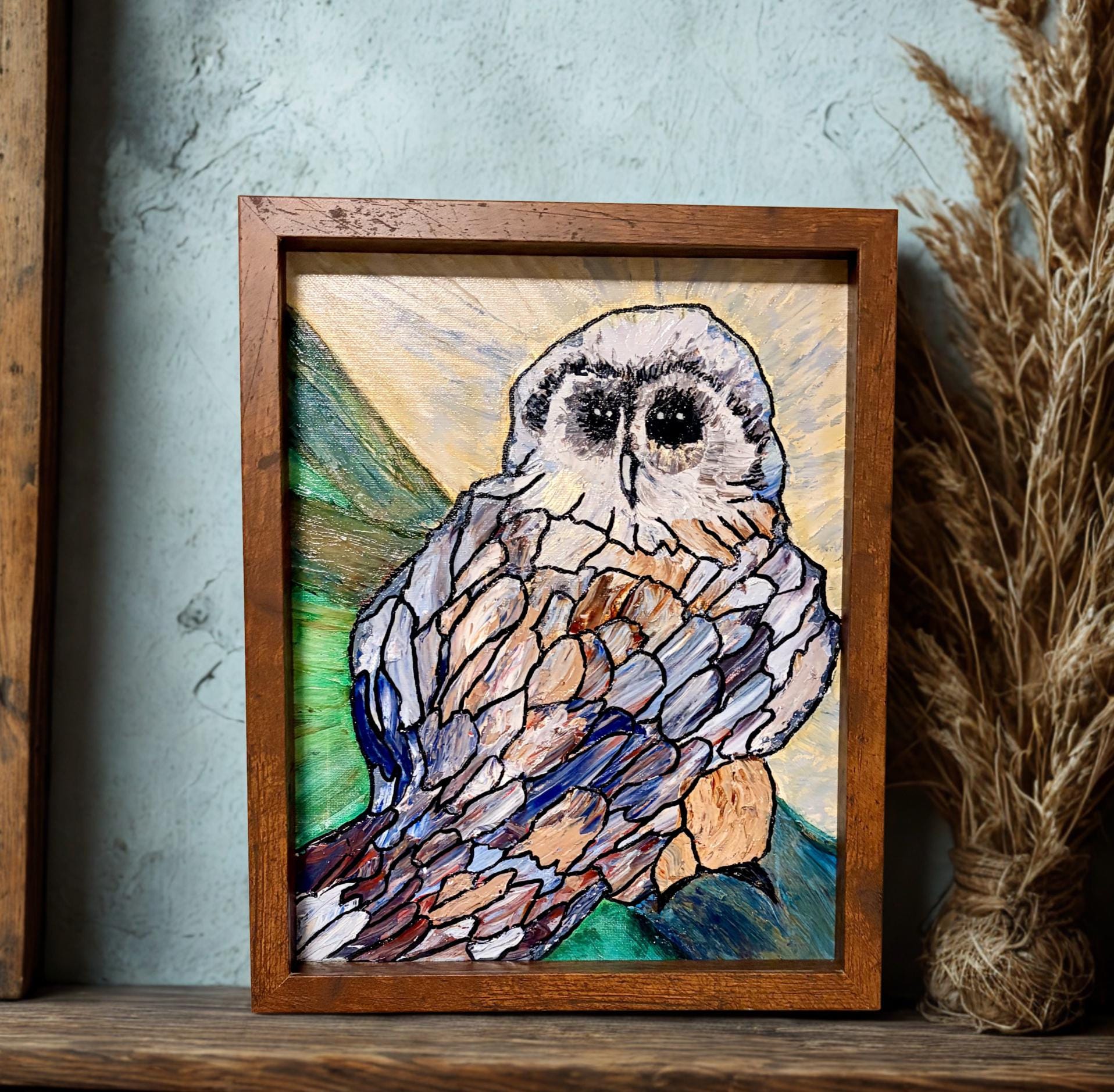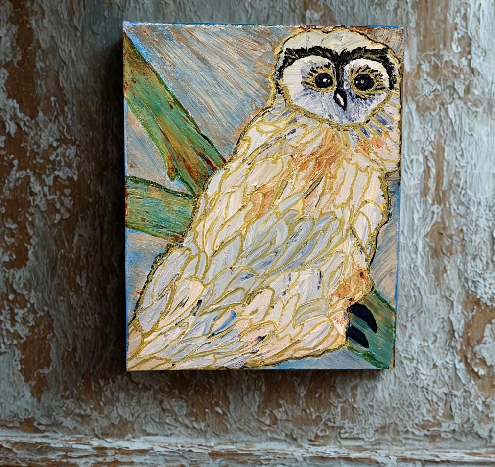 Golden Owl Impasto, Acrylic on Canvas, 10 x 12 x 0.5 inches, $75