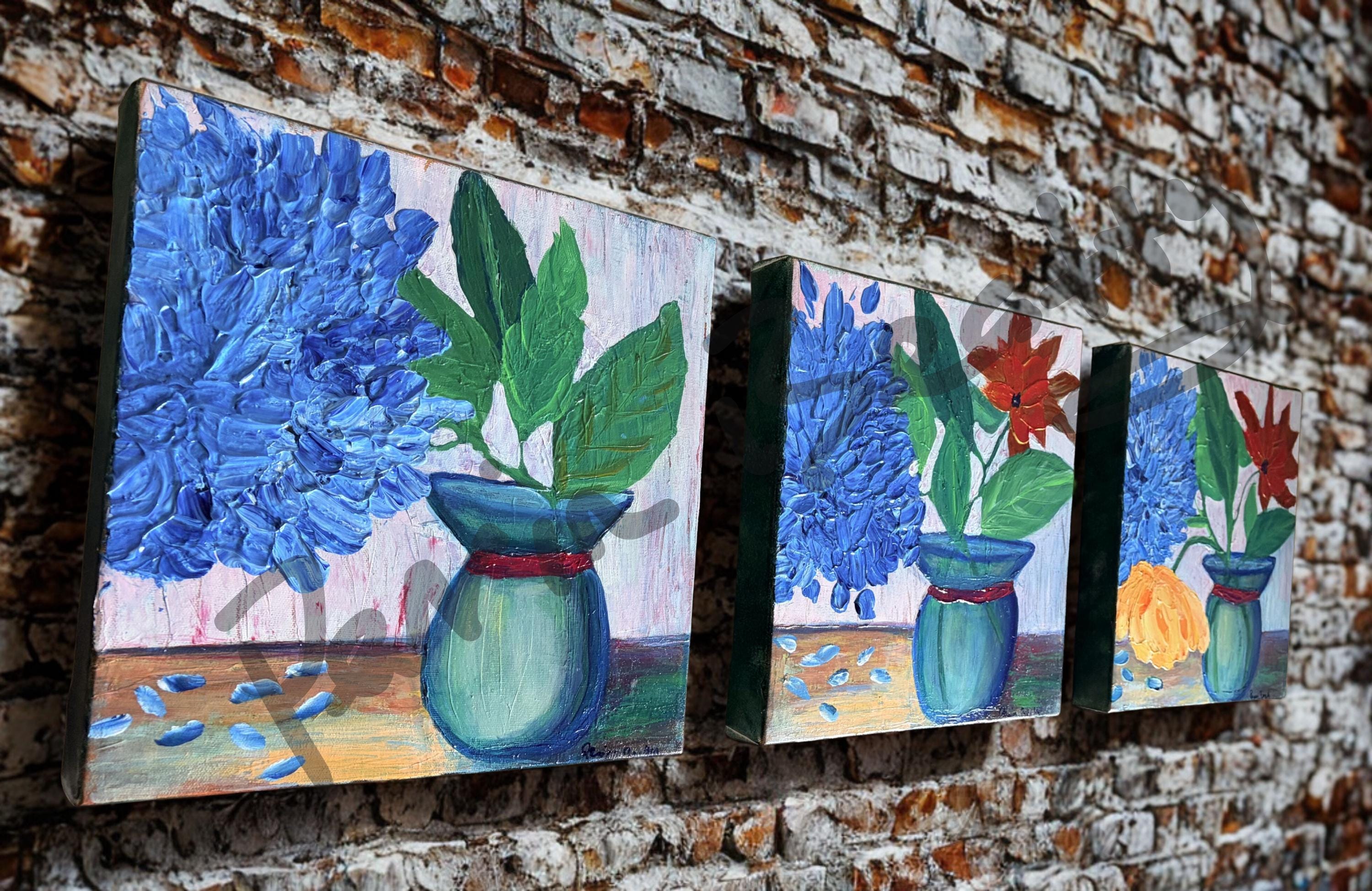 Still Life Impasto Tryptic, left to right: Blue, Blue Red, Blue Red Yellow, Acrylic on Canvas, 12x12x1.5 inches, $100 each or $250 for trio.