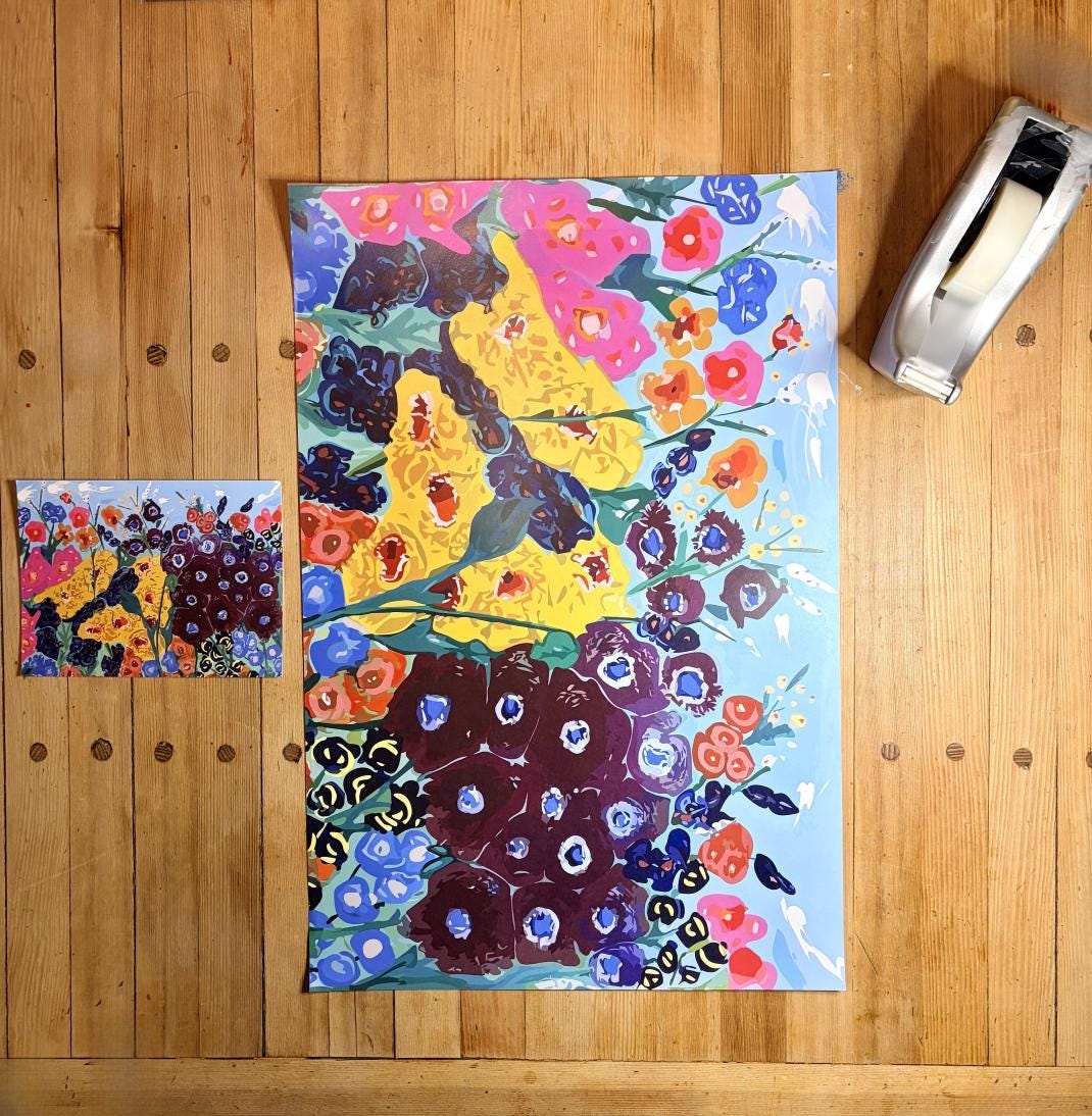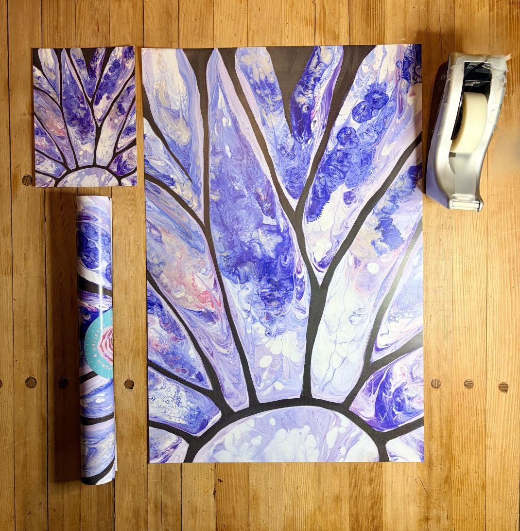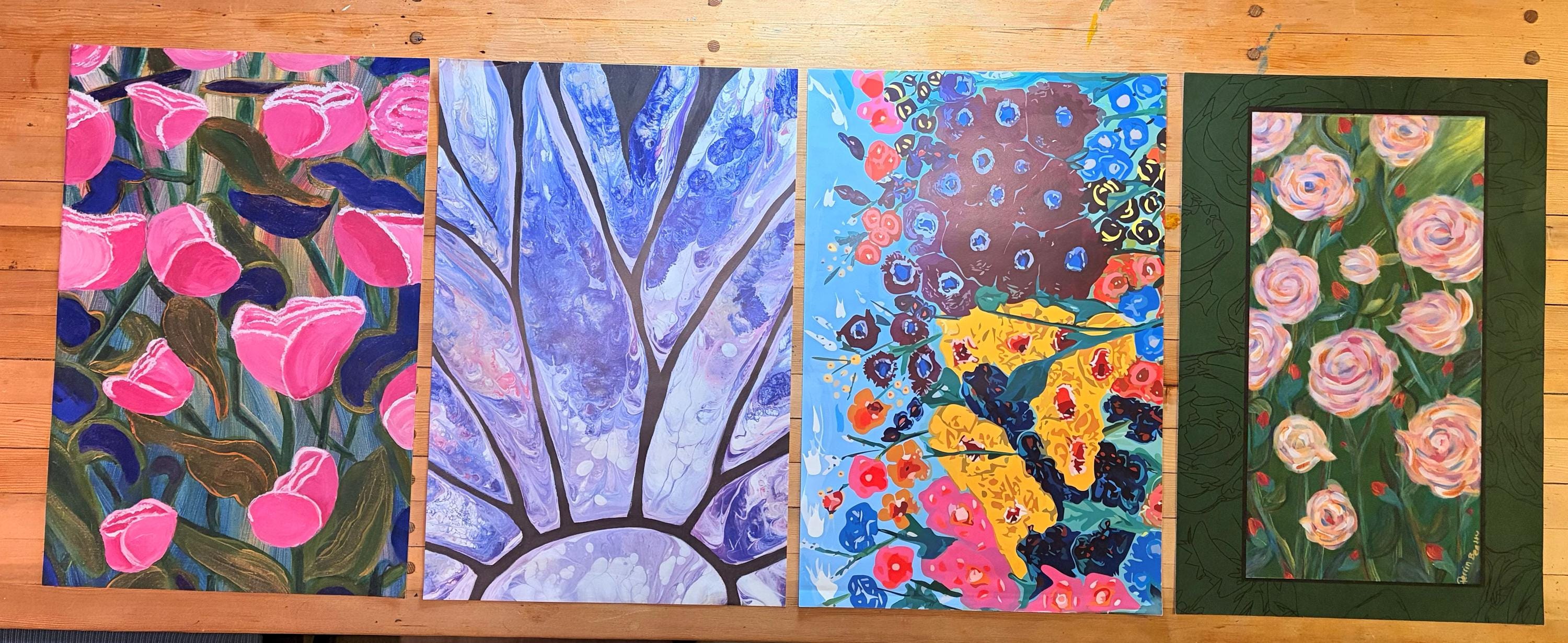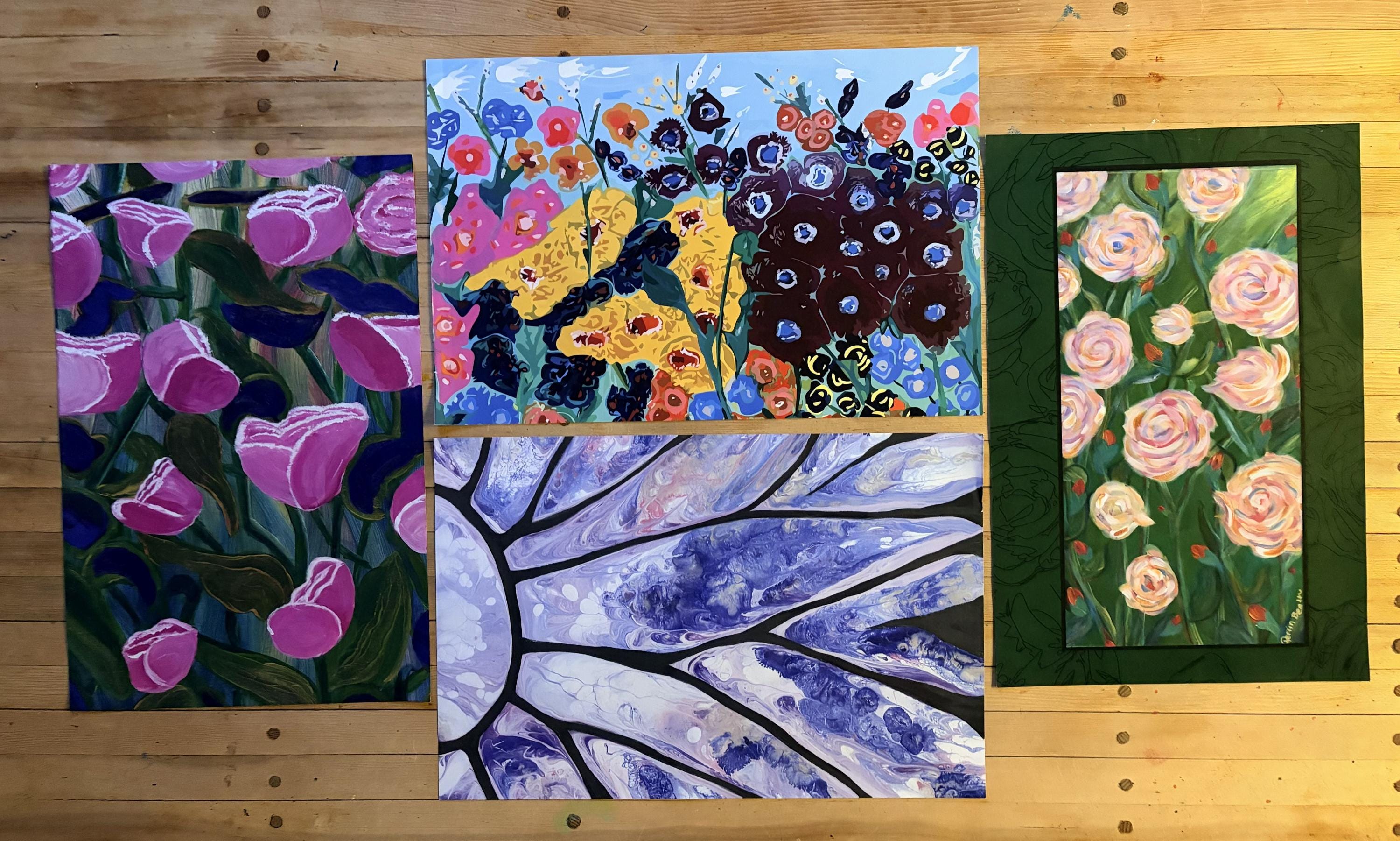 Four floral gift wrap sheets, featuring my original acrylic paintings, (from left to right) Lush Pinks, Summer Flowers (top), Blue Daisy (bottom), and Backyard Roses. The wrap was created and printed in Canada.